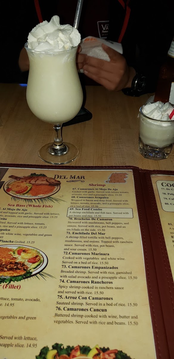 A flour tortilla filled with shrimp, onions, bell peppers, mushrooms and cheese. Topped with ranchera sauce. Served with sour cream, rice, pot beans and guacamole.